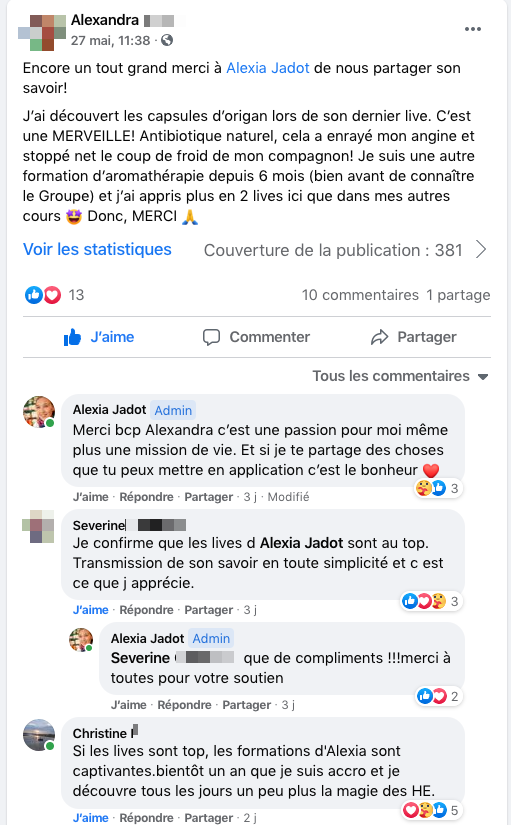 Alexia merci pour tout je ne pensais pas aller jusqu’au bout mais ta passion et ton partage m’ont poussé à aller plus loin que je ne pensais. J’ai encore tellement à apprendre mais je ne te remercierai jamais assez de m’avoir fait découvrir ce monde merveilleux des huiles essentielles