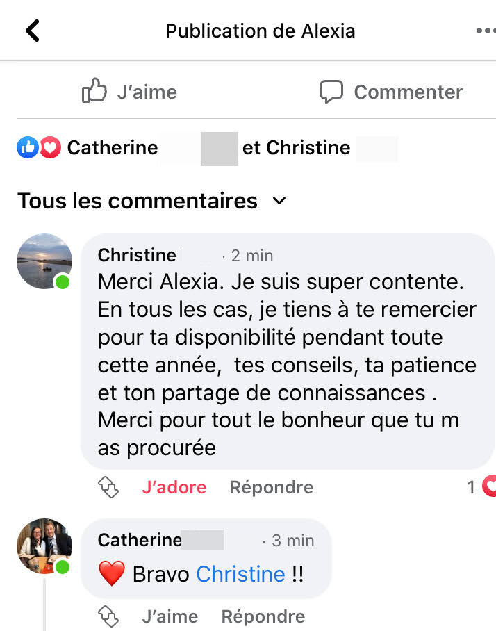 Alexia propose une formation de qualité. Je suis très satisfaite de la suivre. Le contenu est riche, très qualitatif. Et surtout bien organisé. Les sessions de groupe et le groupe Facebook qui viennent la compléter sont d’une ressource inestimable.